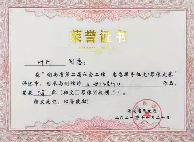 2021年,我司多名員工積極踴躍投稿參與由湖南省民政廳主辦、湖南公共頻道承辦的湖南省第二屆社會工作、志愿服務征文暨影像大賽。他們講述平凡而偉大的故事,展現社會工作者精神風貌,傳播真善美,弘揚正能量。其中兩篇原創征文作品、三幅原創影像作品在比賽中脫穎而出,榮獲一等獎1個、三等獎3個、優秀獎1個。